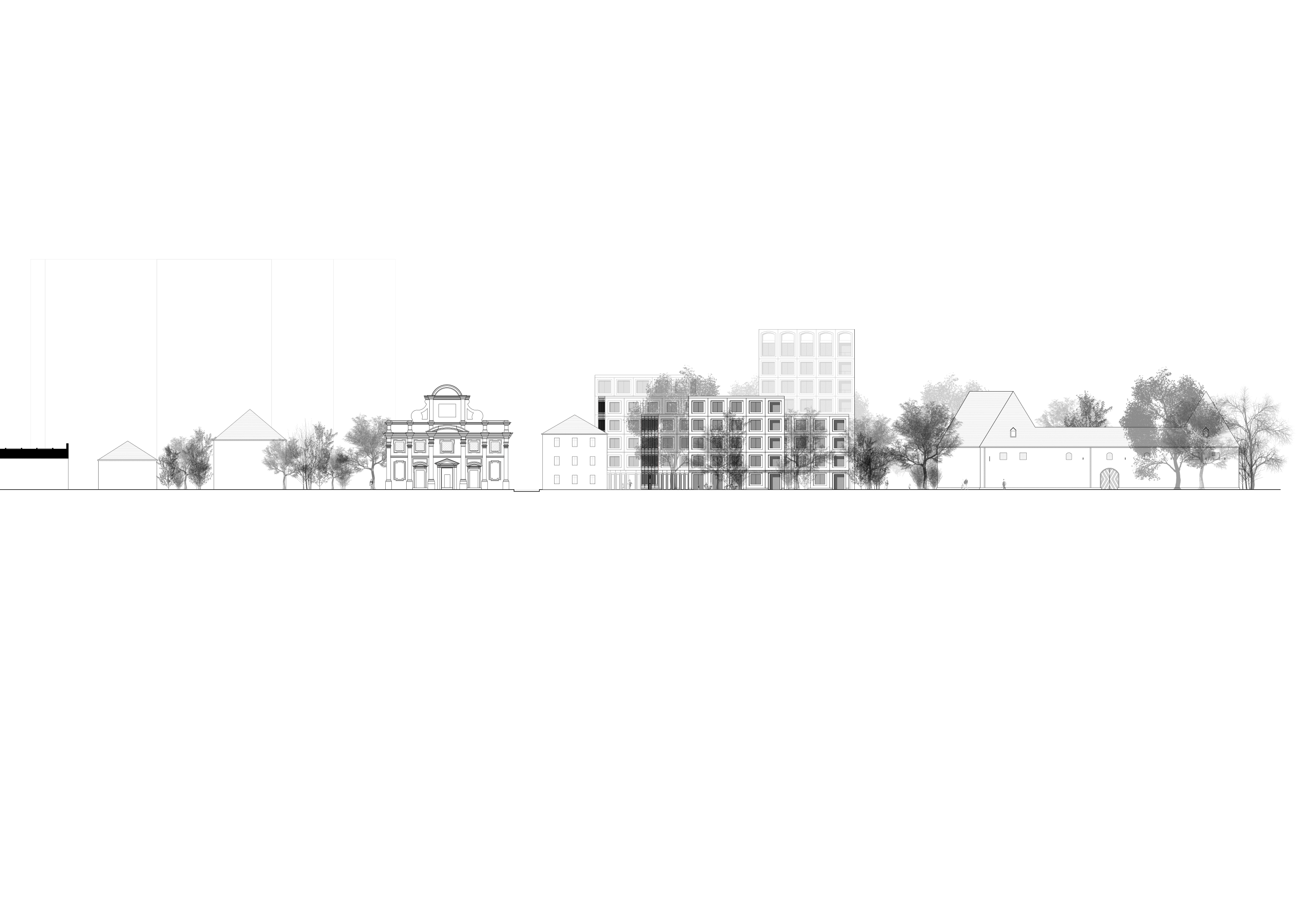Hier endet die neu gestaltete Parklandschaft an einer die Gebäudekuben im Erdgeschoss verbindenden Kolonnade. Die Fassaden der Wohnhäuser werden mit eingefärbten Betonelementen ausgeführt, Schlichtheit und Farbigkeit erinnert an das historische Zeughaus und die nahen Berge. Eine elementierte und vorgefertigte Bauweise sichert eine wirtschaftliche Ausführung.